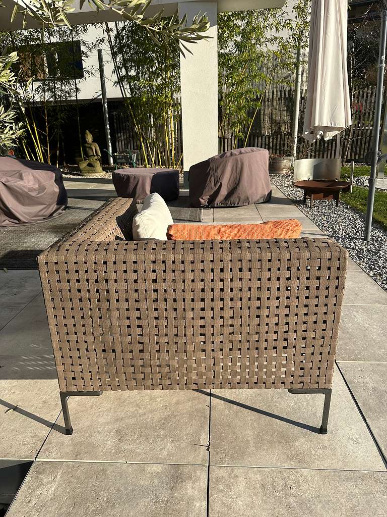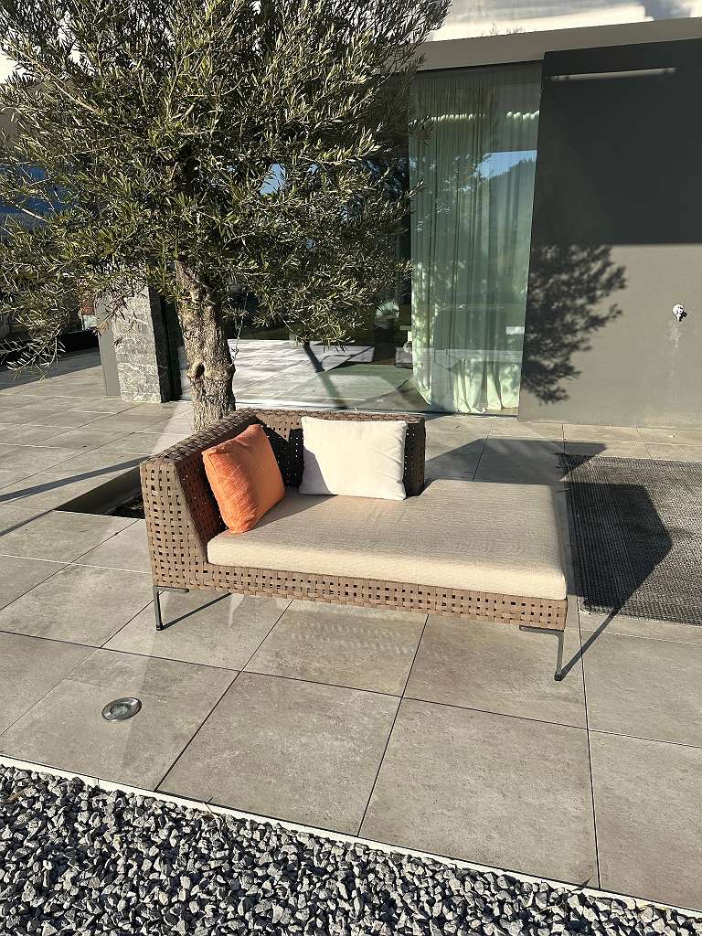 Die Charles Outdoor Chaiselongue überträgt den zeitlosen Stil des Innenraum-Klassikers von Antonio Citterio in den Außenbereich. Das Design besticht durch ein elegantes Geflecht aus braunen Polypropylen-Bändern auf einem leichten Aluminiumgestell.