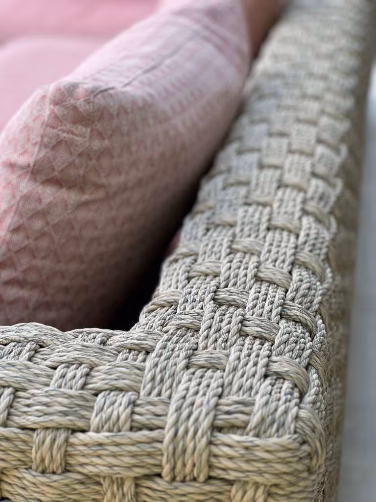 Das Sitzprogramm Ray Outdoor Fabric überträgt den Erfolg des Innenbereichs nach draußen. Es zeichnet sich durch ein geflochtenes Bandmuster aus UV- und witterungsbeständiger Polypropylenfaser aus, das speziell für Langlebigkeit im Freien entwickelt wurde.