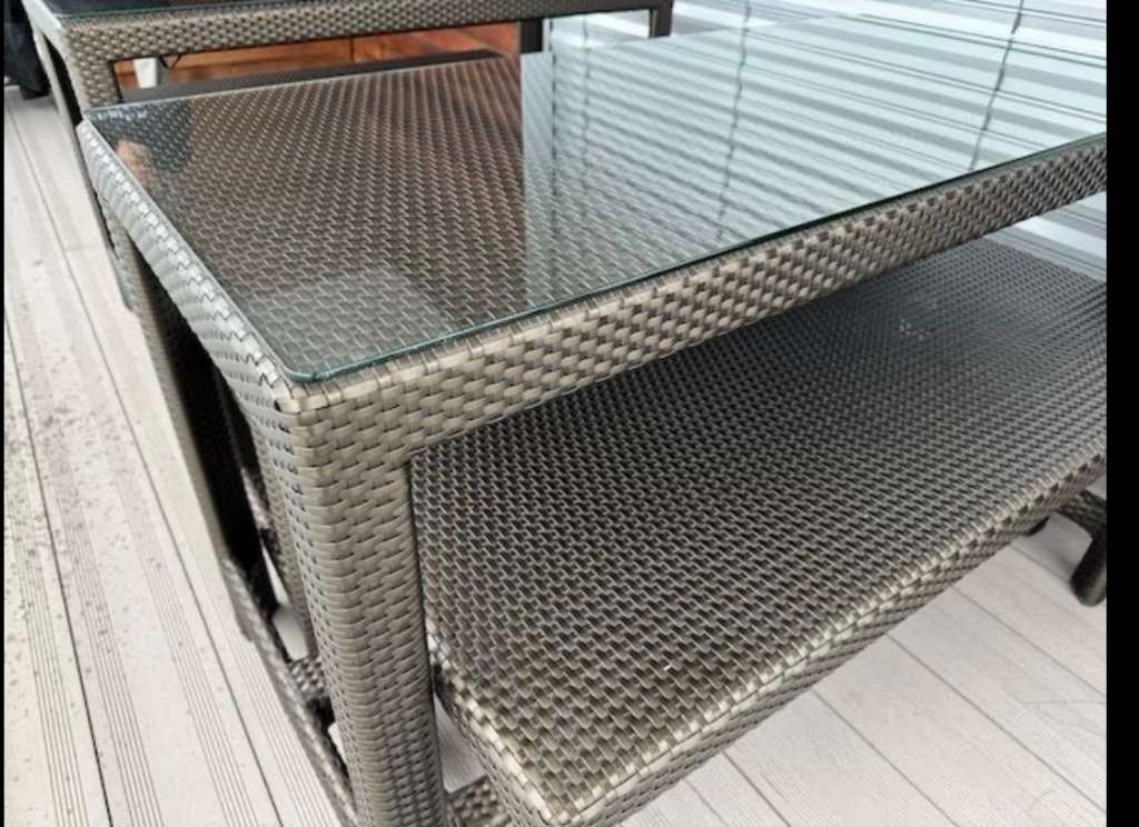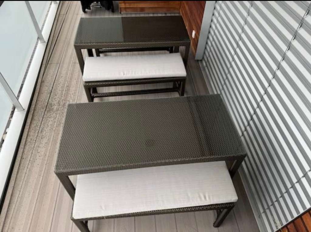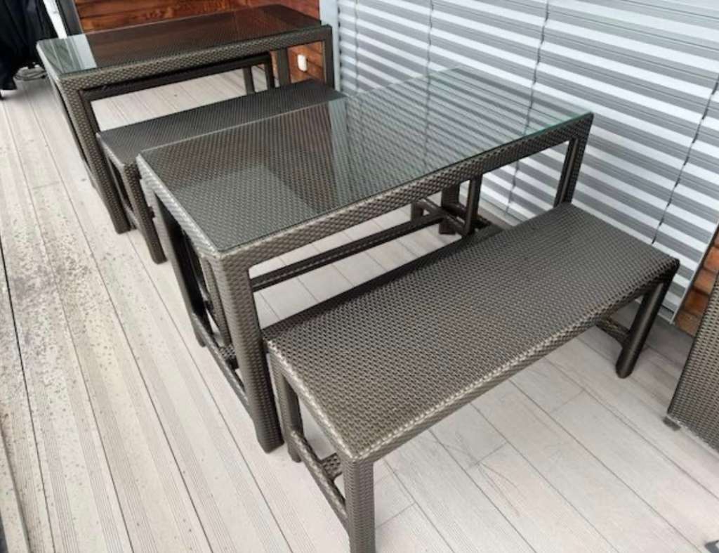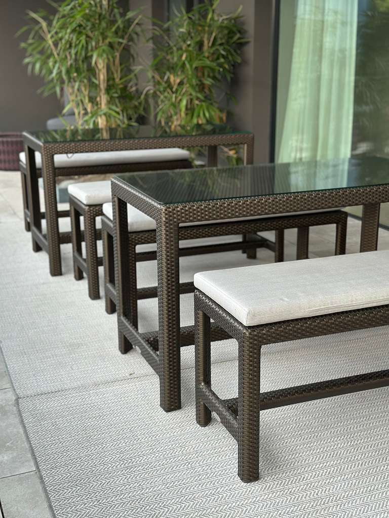Dieses umfangreiche Set in der Farbe Bronze besteht aus zwei Tischen (inklusive Glasplatten) und vier passenden Sitzbänken mit Original-Sitzkissen.