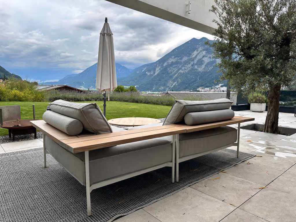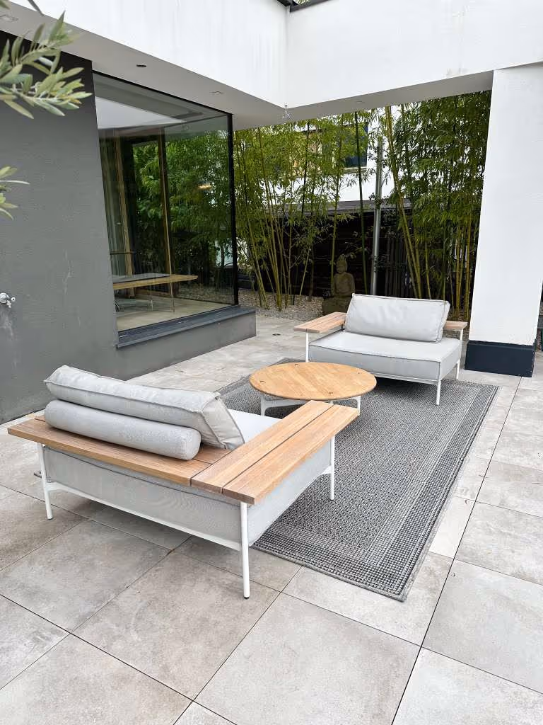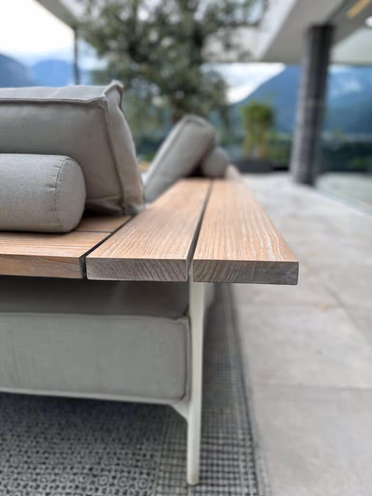 Die Tray Kollektion von Gloster verwandelt die Outdoor-Lounge in einen Ort der Ruhe. Das komfortable und funktionale Design besticht durch eine breite Plattform aus poliertem Teakholz, die nahtlos in Arm- und Rückenlehne übergeht.